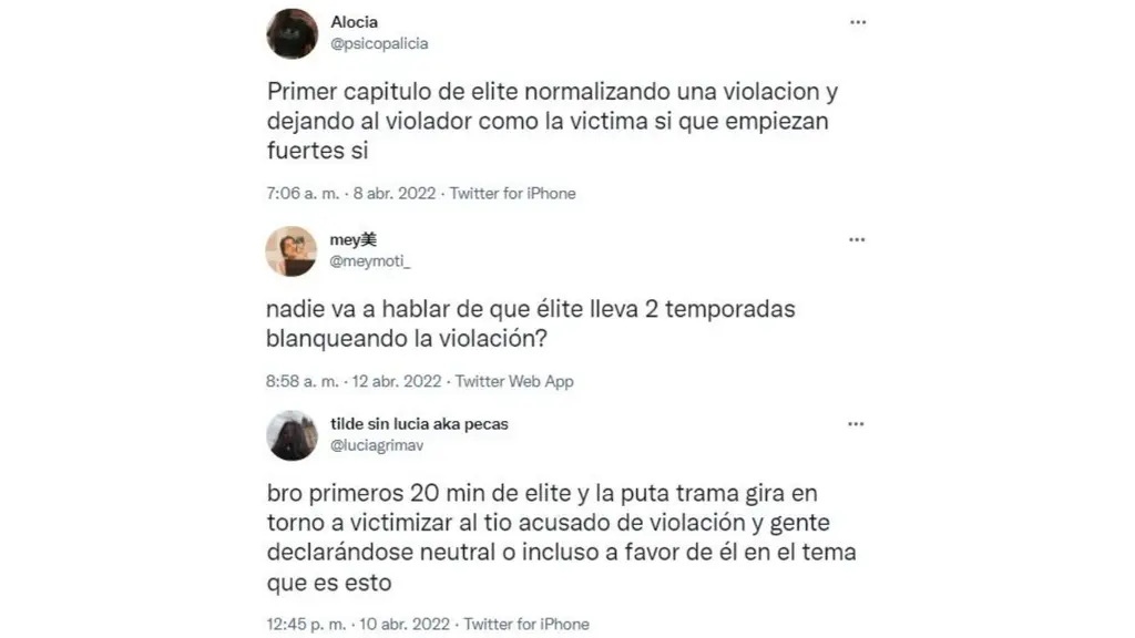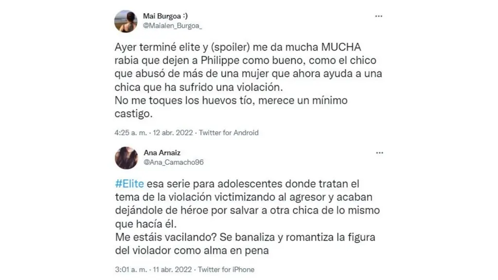 ¿Qué mierda es esta de Élite, banalizando algo tan serio como una violación Y victimizando al verdugo? ¿De verdad creen que esto es normal? Me da igual lo que intenten mostrar, que sea ficción… se trata de una violación y solo hay una víctima. PUTO ASCO