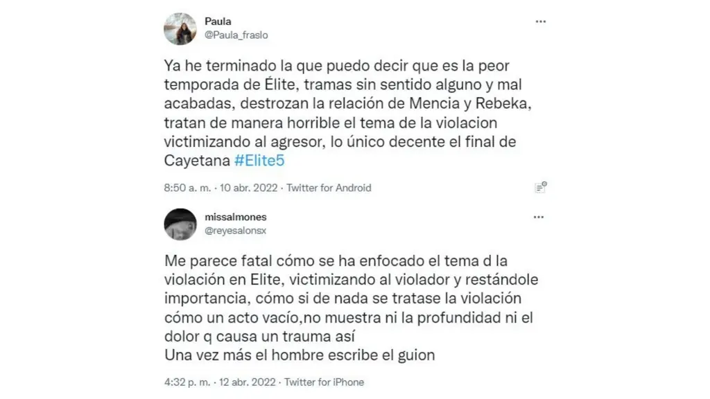 La incierta muerte de Samu no es el único hecho comentado en redes sociales sobre la quinta temporada de ‘Élite’, algunos espectadores han criticado la forma en que se abordó el tema de la violación.